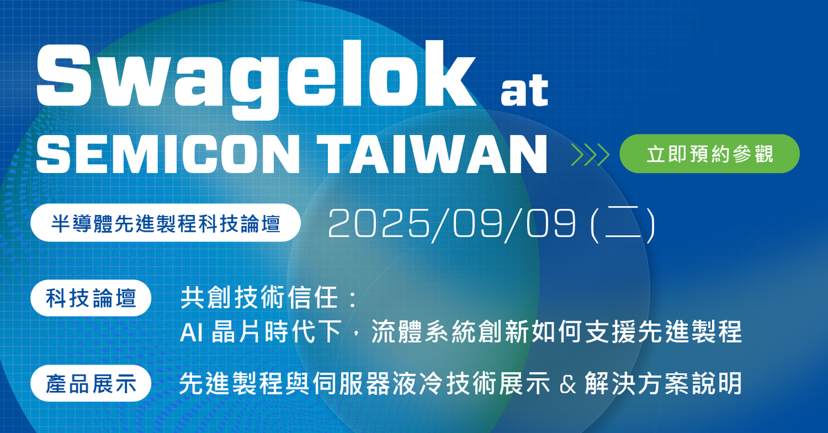 親愛的貴賓 您好, Swagelok 將於 SEMICON Taiwan 2025 期間舉辦產品展示會, 聚焦於 「先進製程」與「AI伺服器液冷」 兩大應用主題。現場將展示多款Swagelok熱門產品,包括原子層沉積閥(ALD Valve)、金屬軟管系列、液冷用接頭與管件等,並由專業團隊親自導覽,協親愛的貴賓 您好, Swagelok 將於 SEMICON Taiwan 2025 期間舉辦產品展示會, 聚焦於 「先進製程」與「AI伺服器液冷」 兩大應用主題。現場將展示多款Swagelok熱門產品,包括原子層沉積閥(ALD Valve)、金屬軟管系列、液冷用接頭與管件等,並由專業團隊親自導覽,協親愛的貴賓 您好, Swagelok 將於 SEMICON Taiwan 2025 期間舉辦產品展示會, 聚焦於 「先進製程」與「AI伺服器液冷」 兩大應用主題。現場將展示多款Swagelok熱門產品,包括原子層沉積閥(ALD Valve)、金屬軟管系列、液冷用接頭與管件等,並由專業團隊親自導覽,協